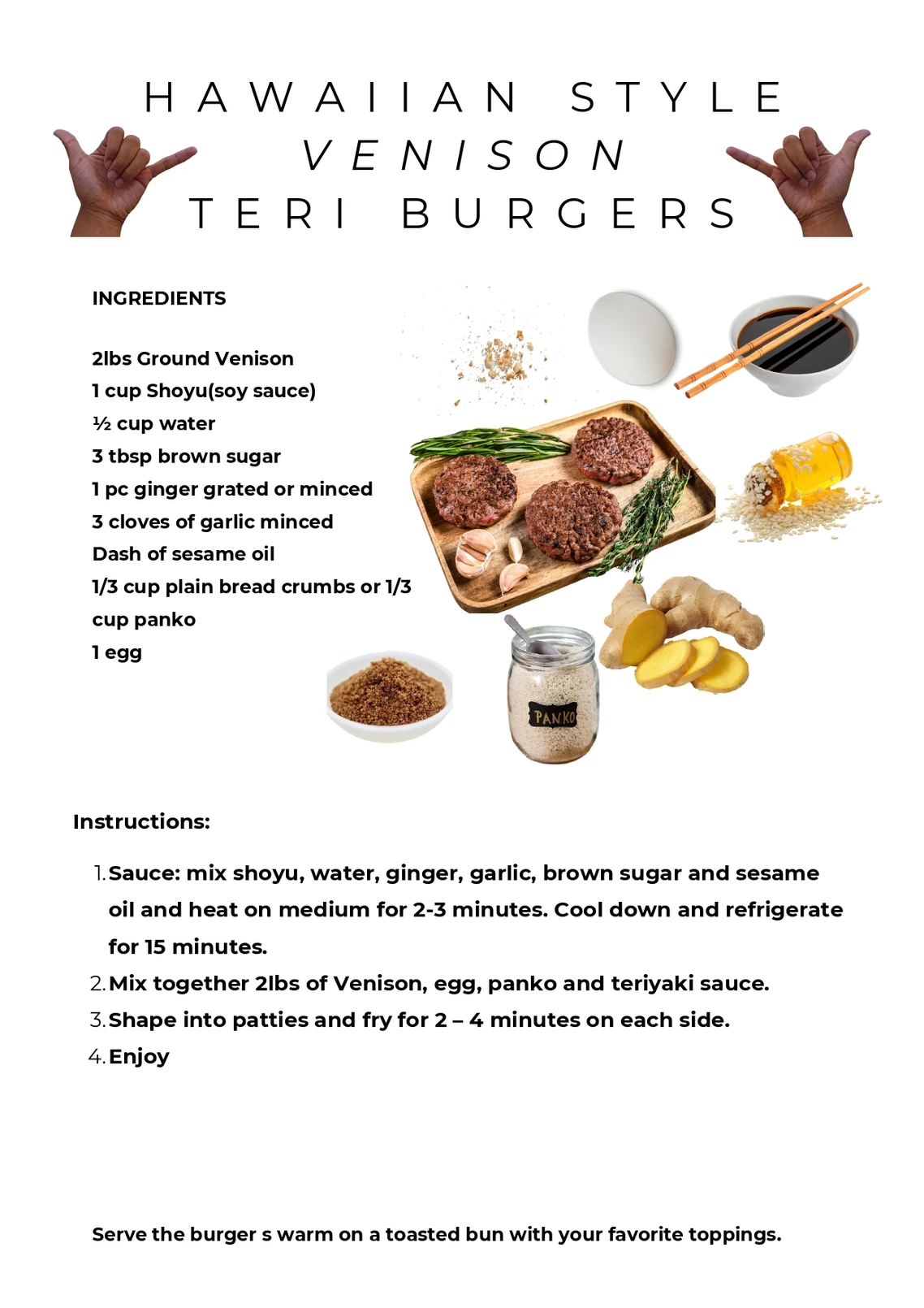 I believe there is a stigma of Venison Deer Meat with the belief that Deer Meat has a gamey taste to it. This is only true if you do not prepare the meat properly. Our Wildlife Management Expert at Mana Ohana Treats has been preparing this meat as a specialty for his family for 20 years now. Over the years he has perfected the process so there is absolutely no gamey taste at all. If you don’t believe me, try out our homemade sausage made of venison. We are happy to give it away free to you so you can see how true this statement is. We have decided to post a video on You Tube once a week of meals made with venison. Our first recipe is Hawaiian Style Venison Burgers. Find us on YouTube – Mana Ohana Treats. Please subscribe and don’t forget to hit the LIKE button for our ohana that put this video together for you. If you would like to get a hard copy of the recipe, please email us at danica@manaohanatreats.com.